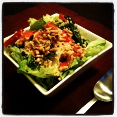 Meng na n paar minuten, als de couscous gaar is, de kruiden, groenten, citroensap en olie naar smaak er door. Top het geheel af met geroosterde pijnboompitten en peper/zout.