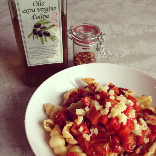 Top de pasta af met de rest van de tomaatjes, met olie en de geroosterde paprika. En dan mag de kaas erover!