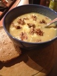 Onlangs was ik bij De Withoef waar de pot tomaten- en pompoensoep met zachte geitenkaas schaftte. Dit inspireerde mij om zachte geitenkaas in de knolselderijsoep te brokkelen. Een zeer geslaagde toevoeging, al zeg ik het zelf.