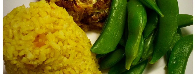 Schap de ringen met een platte spatel op de borden en verwijder de ringen. Serveer met sugar snaps en gele rijst met rozijnen.