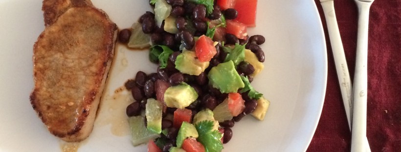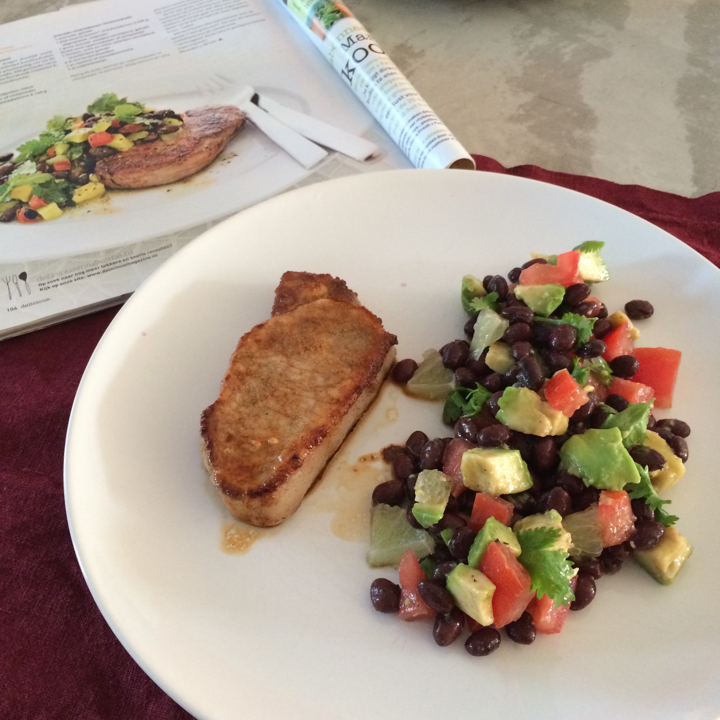Gebakken varkensvlees met avocado-zwartebonen-limoensalade