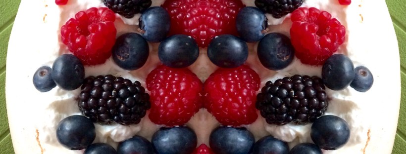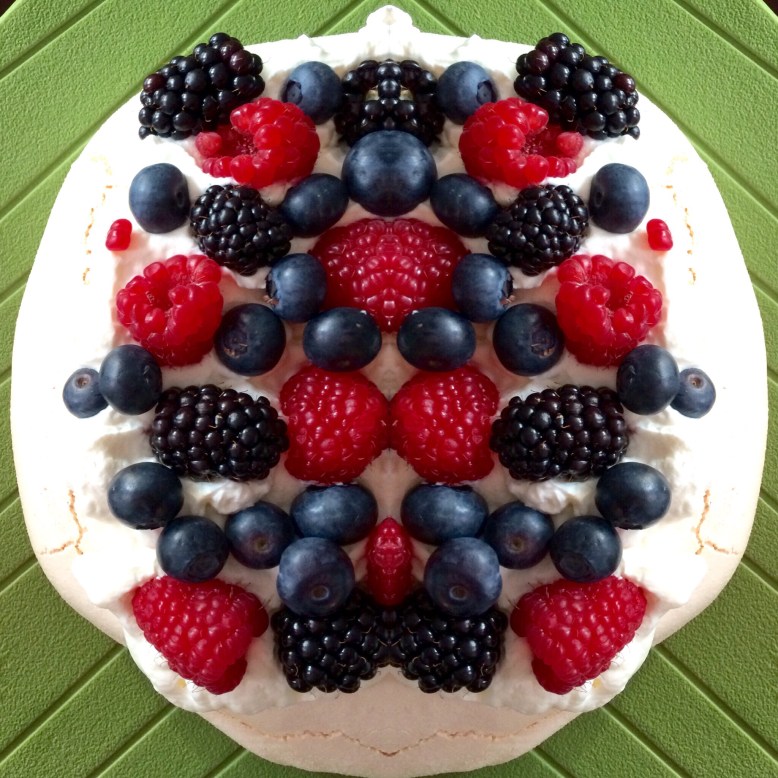 Haal ‘m eruit en leg de taart op een serveerschaal. Sla de slagroom stijf zonder suiker en spatel die op de pavlova. Verdeel het fruit hierover.