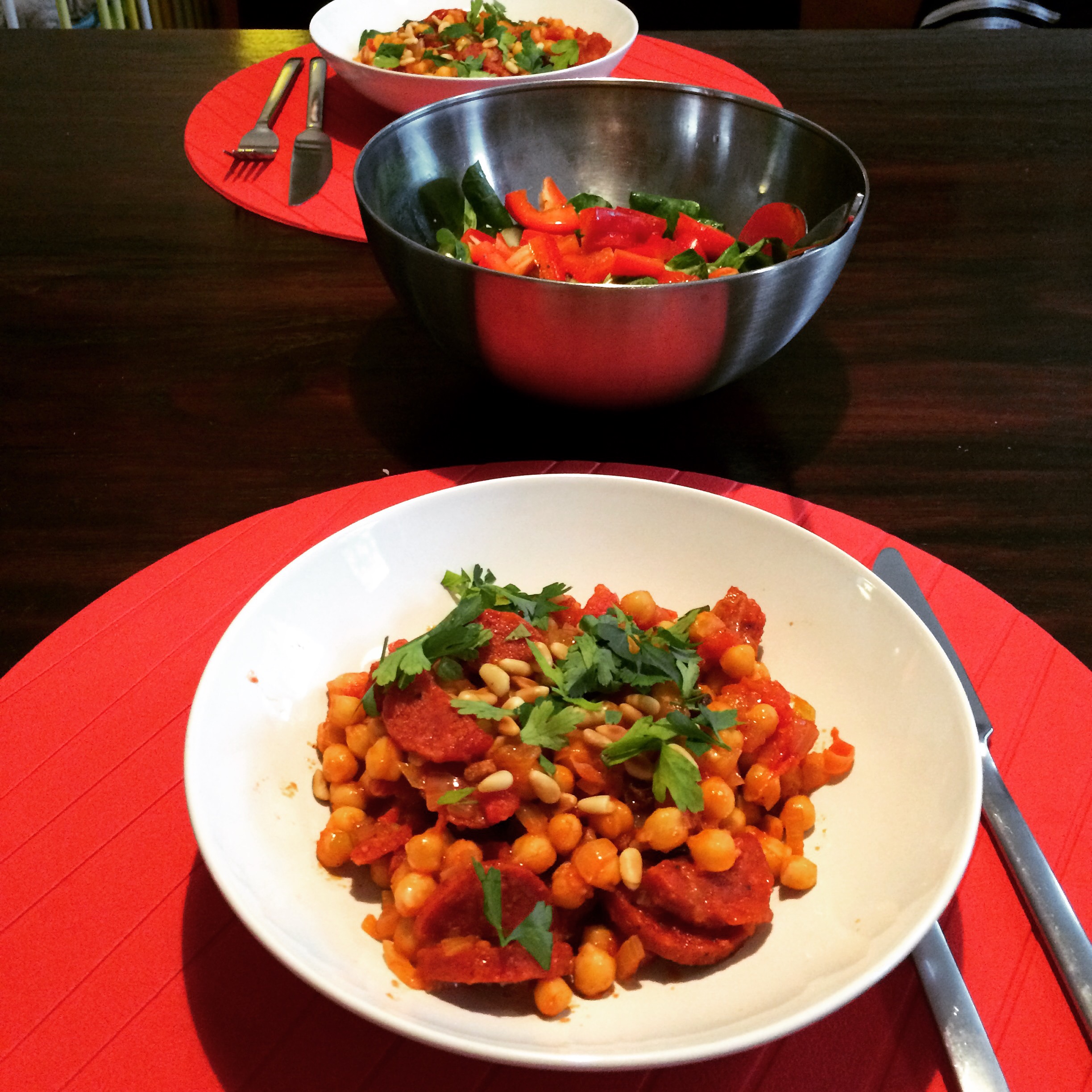 Verhit de olie in een grote koekenpan en smoor de uitjes tot ze zacht en glazig zijn. Voeg de knoflook en de chorizo toe. Zodra het rode chorizovet vrijkomt voeg je de kikkererwten toe, roer alles goed door. Voeg de rozijnen en de tomaten toe en verhit tot alles goed heet is. Proef eerst, en voeg dan naar smaak citroensap, peper en zout toe, het gerecht moet een stevige ‘bite’ hebben.