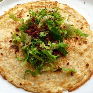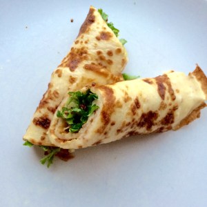 Een restje andijvie rolde ik met de elandworst kruim en een lik mosterd met dille in een pannenkoek. Smikkelen en smullen maar! Wederom een Hollands gerecht met een Zweeds tintje.