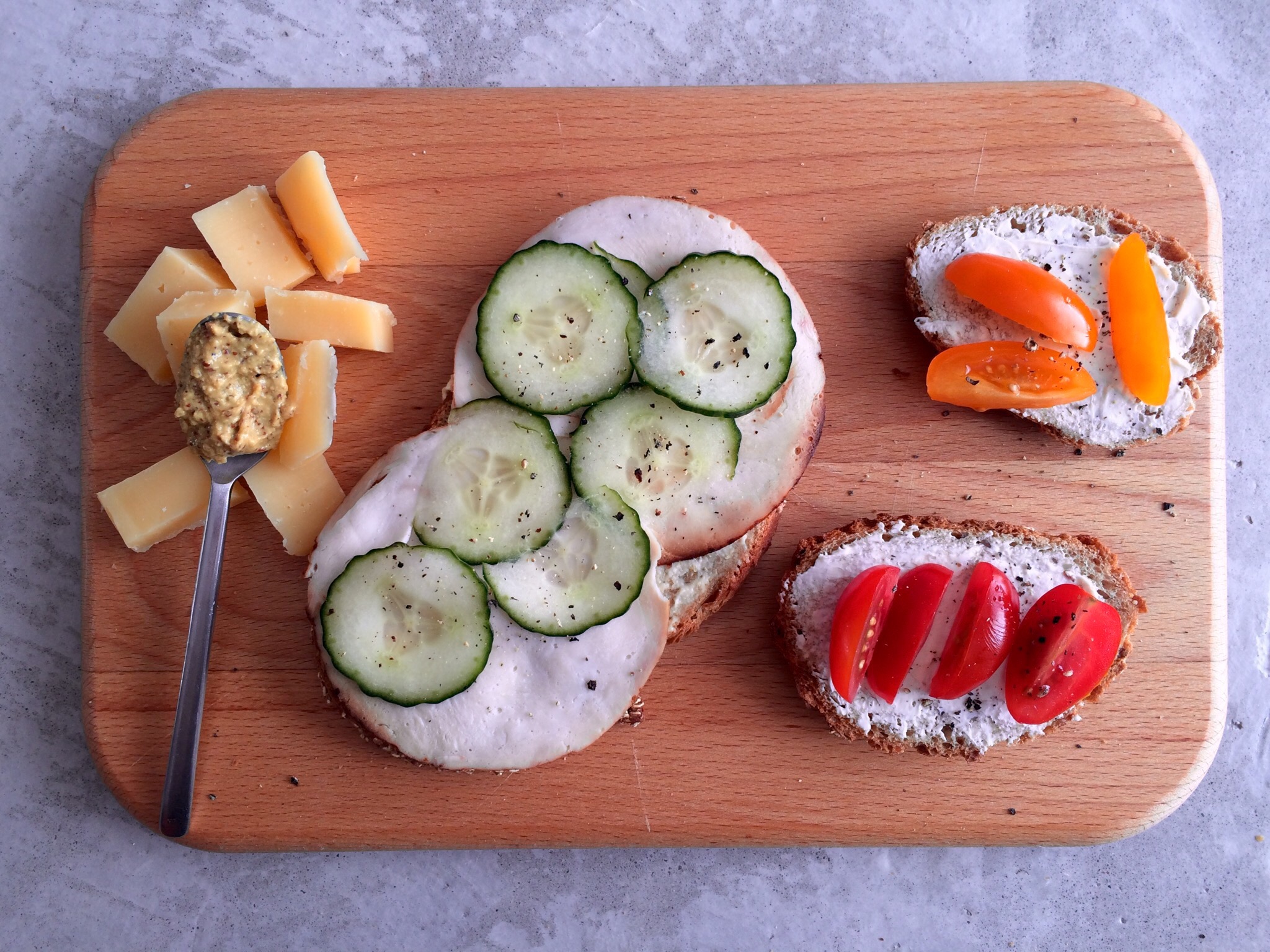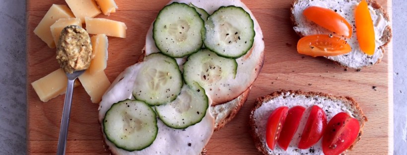 En vandaag snoepte ik dit lekkere plankje leeg; vers brood met knapperige korst, roomkaas/tomaat,humus/kip/kikker en restje kaas met grove mosterd. De version gemalen zwarte peper maakt het af.