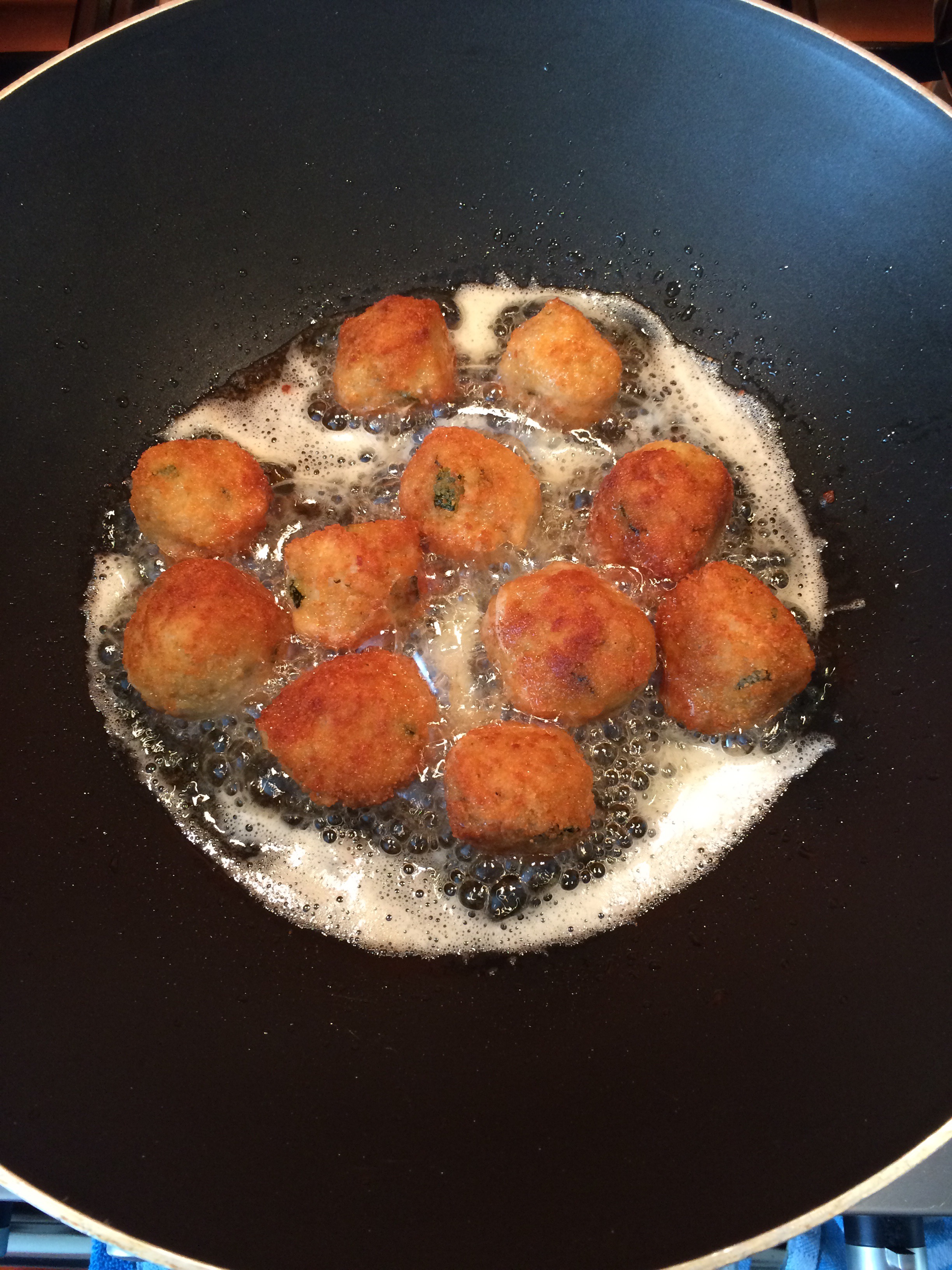 Frituur de balletjes bruin en laat uitlekken op keukenpapier.